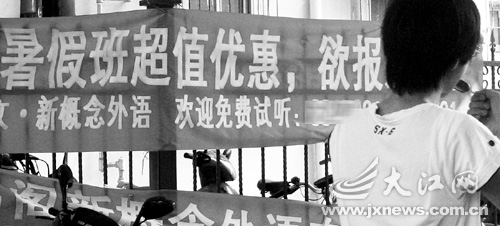 14日11时许,记者来到南昌市叠山路与苏圃路交界处,不少怀抱各种宣传单的宣传员忙着往接学生的家长手中塞宣传单。当记者走到这些宣传员身边时,立即被对方围住,“你家中有小孩需要暑期教育培训吗?我们培训班有名校的一流老师任教”。