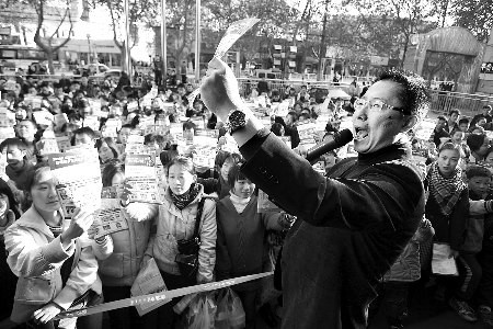 “来,大家都把手里的纸举起来,今天来的人太少了,都怪这个破音响。我一般都是带几万人的。举高、举高,这样拍,明天上报纸会好看一点。”看到读者太少,李阳特别安排大家把手中的宣传册举起来。