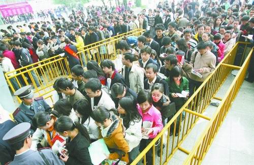 经两天“海选”,由成都市人事局主办、成都人才市场承办的2008成都冬季特大型人才招聘会暨高校毕业生供需洽谈会,昨日(11月16日)在世纪城新会展中心正式落幕。作为今冬规模最大的一次特大型招聘会,今年只有324家企业携6226个岗位前来“选秀”。尽管招聘单位和岗位数量大幅缩水,但两天时间里求职大军数量仍逼近7万。
