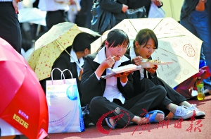 也有同学通过“暗号”联系,如“某学院经管班‘最佳射手’请到主席台”,估计被呼叫的同学是个足球爱好者。也有同学搞恶作剧。当广播中有同学寻找周杰伦时,全场一阵笑声。还有这样的广播,“麻省理工大学的××同学请到主席台,您剑桥的同学在等您”,这在紧张的气氛中制造了难得的笑声。 文/记者 徐静 图/记者 邵权达