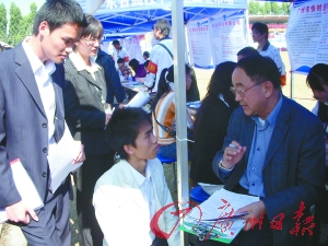 在一家生产和销售模型零配件的公司摊位前,一群人围在一位长者跟前。长者是这家模型公司的主管,公司要招机械设计制造、会计、物流管理等岗位7人,但排了长长的一条队。长者戴着眼镜,手里握着笔,一边与应聘者和风细雨地聊,一边在简历上圈圈画画。来自南华工商学院物流专业的杨同学半蹲在长者面前,足足面试了15分钟。事后杨同学说:“他让我对仓库的整个流程做一个设计,写成一个报告,一星期内发邮件给他。” 接下来的一位女孩面试,长者问她可不可以做仓务,女孩表示可以;长者又问每天要提15公斤东西上下楼100次能否承受,女孩勉强表示可以;长者又告诉她公司的工作时间长,可能没时间谈恋爱怎么办?女孩一时语塞。