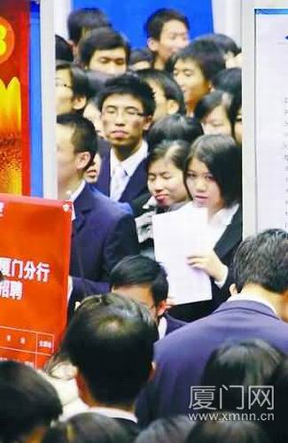 当日在厦大召开的毕业生招聘会,是厦大每年为自己的毕业生举办的,不过,几乎省内的大学都有人赶去参加,使得厦大这一年一度的招聘会首次实行门禁——依照人流量分时段放人入场,有的毕业生花了一小时才递上一份简历。