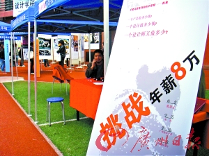记者在广州美术学院大学城校区的招聘会场看到,一个独特的摊位吸引了人们的目光,摊位前摆放着一张白色的“广告”,上书“挑战年薪8万”几个大字,“广告”后面的桌子上摆放着许多设计大赛的获奖证书和奖杯,“优秀团员”、“优秀学生干部”、“优秀团干部”、“二等奖学金”……一张张奖状看得人眼花缭乱,原来这是广州美术学院毕业生莫忠才的“展位”。