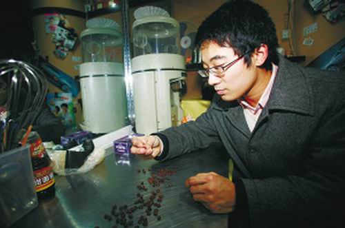 陈寅嵩展示他购买到的哥伦比亚咖啡豆。记者 张晓 摄