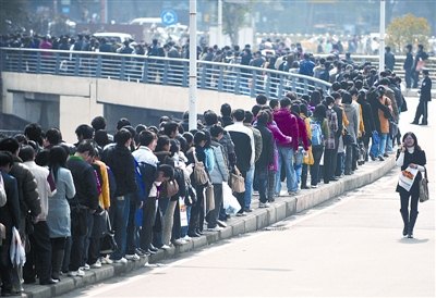 20 日,“湖北省2009年新春大型人才招聘会”在华中科技大学光谷体育馆举办。这场招聘会是2009年春节后首场针对大学生的招聘会,近4万名求职者拥向会场,队伍最长时有3公里。上图:当天下午1时20分,一些学生投完简历走出体育馆,而门外还聚集着大量等待进场的学生。