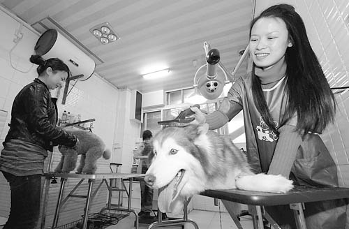 3月31日,宠物美容店店主徐晓娟(右)在为客人的宠物狗美容。2004年,贵州大学经济贸易系的徐晓娟大学毕业后选择自主创业。她在贵阳市开办了一家名为“千宠万爱”的专业宠物美容店,由于服务专业、管理得当,生意一直不错,月收入近万元。她的宠物美容店也成为大中专毕业生的实习场所,先后有20多位毕业生来此打工或学习。