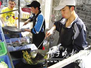许瑞庆是扬州大学旅游烹饪学院05餐饮管理专业的学生,去年北京奥运会期间曾是一名“奥运大厨”。今年2月底从苏州一家酒店实习回到学校后,觉得离毕业还有几个月,闲着也是闲着,为何不搞一个街头小吃摊自主创业呢?他的想法得到了同样是“奥运大厨”的该学院05烹饪工艺班3个如皋老乡薛海峰、谢晓飞、汤伯虎的支持,“我们几个都是农村的,家庭也都不怎么宽裕,凭自己的手艺早点赚钱,早点为父母减轻负担,同样也能早点创业。”小许告诉记者,3月初,他们凑钱准备了餐车,购买了冰箱和其它烹饪器具,在离学校不远处的一条巷子里摆了一个小吃摊,打出了“奥运小菜”的招牌,不仅给自己曾经服务奥运做个“广告”,也诚心诚意地为人们烹制干净卫生、低盐少糖、符合奥运营养健康理念的街头小菜。