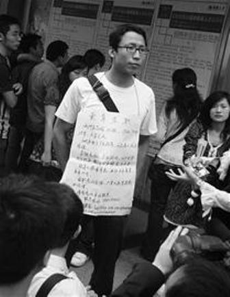 4月26日,一位身着浅蓝色T恤、戴着黑边眼镜的男青年出现在成都市宁夏街人才市场门口。他的穿着打扮很普通,胸前挂的一块“卖身求职”的牌子却十分醒目,引来众人围观。从这块白纸红字的牌子上可以得知,这名男子叫王志强,今年25岁,身高1.75米,大学文化。2005年他南下广东,干过两年管理工作。由于金融危机,企业倒闭,所以“现卖身求职,要求年薪至少10万元。”
