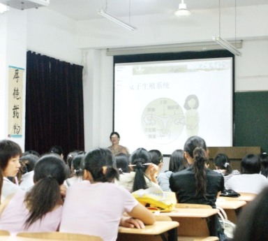 昨晚7点,在该校一间可容纳90人的大教室里已坐满了女生,有的正认真做着笔记,有的与同伴小声交谈着。讲台上,女教师在介绍该课的主要内容,包括女子生殖系统、避孕、妇科病等知识。