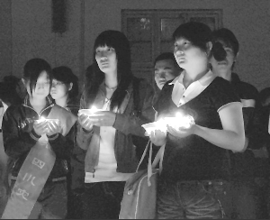 内蒙古师范大学的学生为灾区人民祈福。 (图片据内蒙古师范大学新闻网)