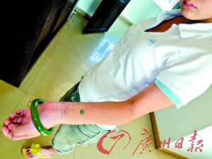 本报讯 (记者卢迎新摄影报道) 15岁花季少女小玫(化名),外表单纯可爱,但却“自割”成瘾。从两年前开始,她常常在课堂上用小刀割自己的手至流血不止,以此来“获得快感、释放压力”。迄今为止,她的手上留下了200多道疤痕,正在广东省武警总队医院青少年成瘾治疗中心治疗。