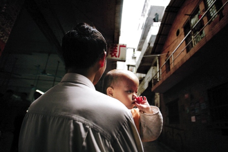 苏屋村中间一栋六层民房的第四层有黄建军的家,仅六七平方米的空间里,有房间有厕所有厨房。儿子的意外身亡,是对两夫妇最大的打击。9年来,他们几乎把所有的心血都倾注在孩子身上,“希望他能做个城里人,读好书,不要像我们一样只能做粗活”。然而,黄建军对现实的“残酷”也有着清醒的认识,“其实我们拿不到户口,不可能像城里人一样享受各种福利,上公立学校的赞助费我们都交不起”。