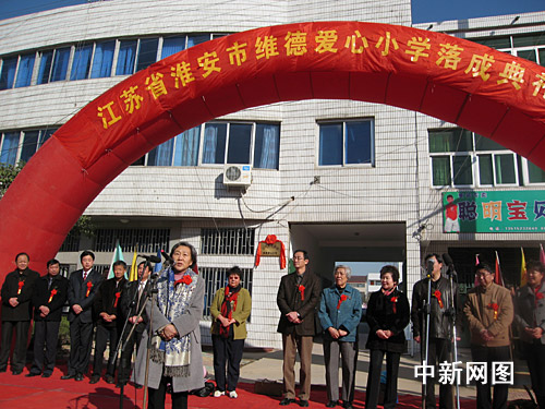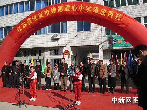 中新网淮安11月28日电 (记者 淮黎霞)一所名为“维德爱心小学”的落成典礼二十七日在周恩来总理的故乡江苏淮安市举行。这所小学的捐赠人是台胞张介玉先生和“台湾爱心第二春文教基金会”,并由中国侨联经济文化基金会兴建。