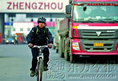 除天气外,来往的车流也给他带来不少麻烦,经常有卡车与他擦肩而过,“有的路段上撒有石子,轮胎碾过时石子打到脸上生疼,好几次都差点出事”。