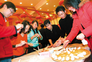 精彩的演出结束后,所有参加活动的学生们一起包饺子。因为不少学生是南方人,包饺子并不在行,饺子的模样也是五花八门,等饺子煮出来更是皮和馅儿都分了家,大家一边吃一边笑,心情很愉快。在南大读大二的毛静是个腼腆的重庆姑娘,不爱说话的她也被现场快乐的气氛感染了,开心地有说有笑,她说,自己家的经济条件不是很好,又加上下大雪,就没有回家。自己是个特别内向的人,本来以为会度过一个寂寞的假期,但是,丰富的活动和周围众多的朋友让她感到了家一样的幸福。
