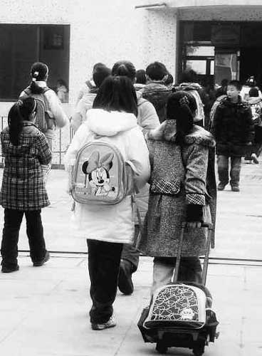 2月21日早晨7点50分,上海师范大学附属小学门口,学生们陆续走进校门,五颜六色的书包有大有小,不光有单双肩背的,还有了带拖轮的“拉杆箱”。