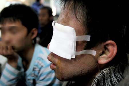 中日联谊医院的值班医生说,伤者脸部、脖颈等多处被烧伤,脸部已经被毁容,眼睛已经看不清任何物体,因为没有钱,目前只做了常规的检查,从被伤害的程度看,如果不能及时治疗,随时有失明可能。听到这个消息,时东旭的情绪有些激动,“我才18啊,我不想瞎啊!”虽然眼睛被纱布蒙住,却没有挡住时东旭的泪水。