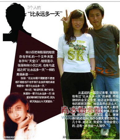 他们有一个共同的情人———45岁的女班主任张丽(化名)。贵阳市公安局云岩分局指控,因何小厉阻挠孟超与张丽的恋情,造成孟超故意杀人。