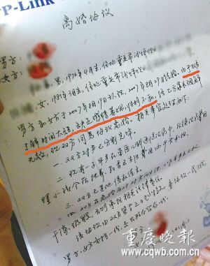 西南政法大学法律系研二学生李永(化名)在和女子向茗(化名)认识10天后闪电结婚,本月21日,向茗早产生下一子。昨日,记者从向茗处了解到,他们夫妻已拟好《离婚协议》,准备于近日到沙坪坝婚姻登记处登记离婚。