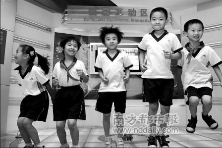 省地震科普馆“试震互动区”内,孩子们跳起体验“震级”。记者姬东摄