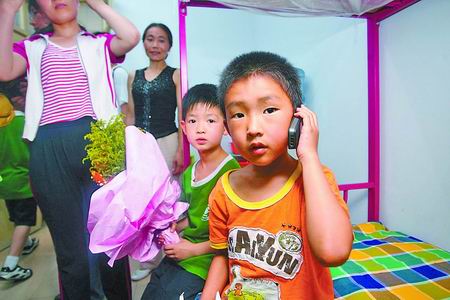 “爸爸,我到学校了……”校车停在了北大附小校园后,刚下车的小伟(化名)接过一名阿姨递过来的手机,给在都江堰的爸爸打了个电话。听到爸爸的声音,这个6岁的小男孩眼里溢满了泪水。一直跟在他身边的邱瑜怜爱地看着他。