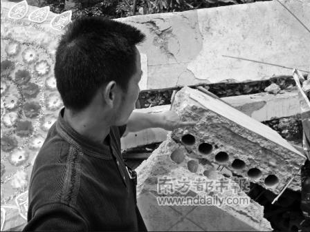 熊永豪认为,除了设计上的先天不足,教学楼在后期施工中,也存在不少隐患。站在废墟上,他随手捡起一块砖头,上面光滑平整,几乎没有粘着水泥。“这表明两个问题,可能是水泥的标号不够,或者是涂在砖上沙灰饱和度不够。”熊永豪说。