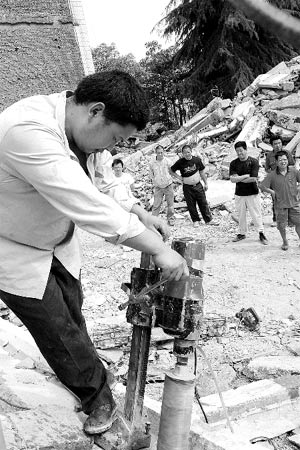 家长们很不理解,大声质问:“为什么不透露单位名称?我们怎样得到检测结果?”“我们是四川禾力建设工程质量检测有限公司的。”工作人员忙说。该公司另一组取样人员,正在对绵竹市几所学校的建筑废墟进行取样。随着机器的转动,一个个标本从大梁中取出,他们在样本上标注上日期和地址等信息。