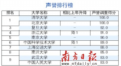 虽然清华和北大的地位难以撼动,但在综合榜单中,第三到第十名的位置还是处于一种“动态的平衡”中,去年排名第五的浙江大学超越了南京大学和复旦大学,跃居第三,中国科学技术大学、南京大学、复旦大学、上海交通大学、北京师范大学、哈尔滨工业大学、南开大学、中国人民大学(含并列)依次排名第四至第十。去年排名第十的中山大学今年排名第18。