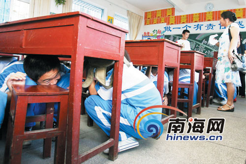 11日下午,海口市地震设防中心副主任、全国十佳少先队志愿者辅导员何照全向海口一中初中部的老师们进行抗震培训,在记者及海南广播电视台音乐广播节目部副主任卫华的建议下,何照全随机指导初一某班学生进行防震演习。他先向学生们讲解了防震的基本常识:如果在学校教室上课,从颠簸与摇晃中断定是地震,老师应立即命令大家不要慌,迅速蹲下来躲在桌子下,最好再拿书包护着头部。待地震停止时,老师立刻组织学生们有秩序地撤离,到操场上集合。