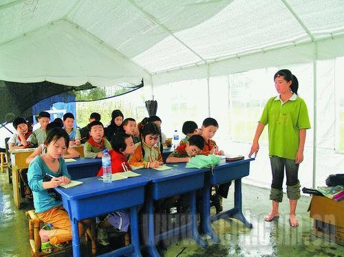 由于只有一顶帐篷,他们借来床单拉起帘子隔出小学、初中两间“教室”。课桌是从茶馆里借来的几张麻将桌,黑板是从废墟中扒出来的两扇门板,作业本是将一个本子裁成两个凑和的。