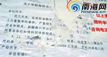 校方贴在海师第二食堂外面公告栏的悬赏公告(本网记者 汪德芬摄)