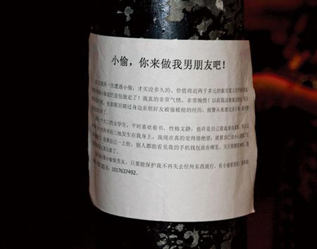 14日晚,网友“总挨偷的女孩”在该帖子后面回帖说,已经将4张征小偷做男友的告示贴到市中心。记者赶往现场后只发现两张,其中百货大楼对面的公交站旁一根灯柱上面有一张,众多市民正好奇地围着灯柱观看。另外一张贴在朝阳广场一个广告牌下。