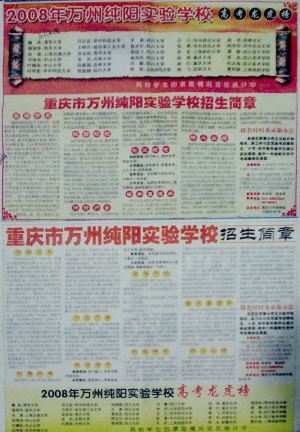 昨日,万州多所学校老师向本报投诉称,该区纯阳实验学校造假,编了一个叫魏来的考生,在报纸上打广告说他考上了清华大学。记者注意到该招生广告分两部分,上面是“2008年纯阳学校高考龙虎榜”,下面是招生简章的具体情况。龙虎榜上是该校今年高考录取动态,包括学生姓名和录取院校。其中排在榜首的叫“魏来”,录取院校是清华大学。广告在本月14日和16日两天刊登,一时间纯阳实验学校今年有学生考上清华大学的消息,成为当地很多家长和市民的谈资。万州某中学一位不愿透露姓名的中干说,一些家长就此拿着报纸骂他们,有那么多好的生源却教不出“北大”、“清华”来,他们感到很是委屈。