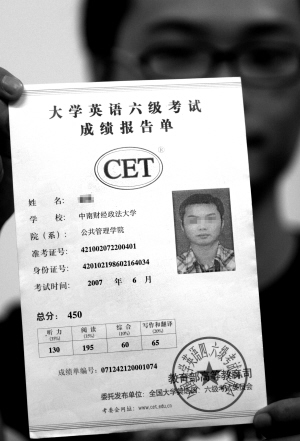 假证几乎能乱真,还能网上查成绩。四六级考试结束后,高校内贴满了办证广告,号称花几百元,就能办到以假乱真的四六级证。