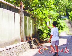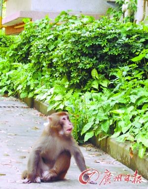 广东外语外贸大学校园东北角是几栋教工宿舍,隔着围墙,外面就是郁郁葱葱的白云山。“大概5天前,我看到墙头上蹲着一只猴子,就回屋拿香蕉过来逗它。它盯着香蕉,又看了我几眼,之后溜下围墙跳到我身边,用前爪拍拍我的腿。看它可怜,也多少有点害怕,我把香蕉扔给它,它就自己剥开香蕉吃了。”住在这里的郑叔告诉记者,这是一只成年猴,个子有70厘米左右,样子很可怜,一点也不凶。“我在这里住了三十多年了,还头一回看到猴子下山。”