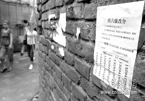 昨日上午,记者接到武昌某大学学生的投诉,称又有人在学校附近张贴了“四六级改分”的广告单。记者前往采访见到,广告标称可“解除你找工作、升学的后顾之忧”,并留下了联系电话和QQ号码,不时引来学生观看(如图)。