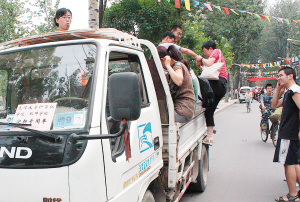 天津大学“新生报到处”所在的教学楼门前,整整齐齐地停着一排面包车、小货车,每辆车上都贴着“迎接新生专用车”等标志。新生登记后,高年级志愿者就会帮他们将随身行李装上汽车。能容纳五六个人的面包车塞下行李之后,载上新生一家三口,一般就再也挤不下人了。从老师们口中得知,仅仅昨天上午,他们就在两地往返了二三十次。