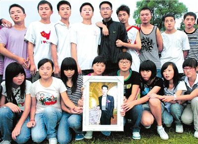 在孩子们排成两行的弧形队列里,居于中心位置的是一个很特别的“老师”,“他”不是一个有血有肉的人,而是一个彩色画框。画框里,身材颀长的他,打着领结,戴着眼镜,笑意盈盈,神采飞扬。他叫何海平,是这个完整存活下来的北川中学初三(4)班的班主任、英语教师。而今,他的学生们一个个都还活蹦乱跳的,他却永远地走了。