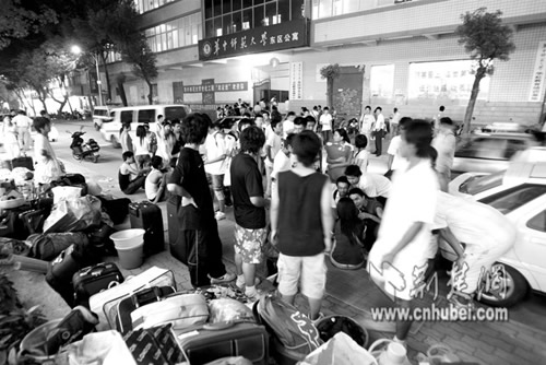 昨晚8时30分,记者在卓豹路华中师范大学东区公寓门口看到,300名学生将拖箱、凉席等行李铺在道路两边(如图),卓刀泉派出所的警察正在现场了解情况。
