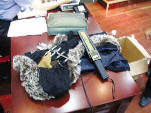 被查获的高科技作弊工具及嫌疑人穿的“作弊大衣”。学涛 陈咏 摄