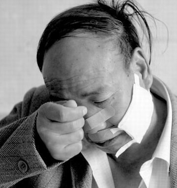 昨日下午,在蓝田县中医医院,王定安正躺在病床上打吊针,脸上包着纱布,医生说,他只是外伤,情况不是很严重。