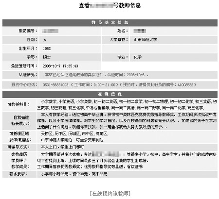 一家网站还推出了特色小班,并称带班老师是在8000多名教师中优选出的济南重点学校的在职老师。网站家教中心工作人员告诉记者,他们推荐的绝对是在职教师,有证。一位在网站找家教的家长告诉记者,自己指名找在职教师,就是因为在职教师有经验。