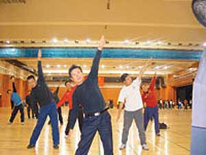 记者昨天在培训现场发现,西城区中小学体育教师几乎悉数到齐,一些老师趁休息空当在琢磨动作。很快,一些上年纪的老师就已汗流浃背。西城区教委体育科胡惠霞科长介绍说,此次培训要求中小学体育老师学会各自需要推广的两套操,培训结束回校后须在一周之内完全熟练,然后向学生推广。预计下月该区中小学生可以正式做起第三套广播体操。胡科长表示,此次培训严把教师关,新广播体操的熟练程度计为教师基本功的一个部分,并纳入体育老师的考核内容,只有培训合格的体育老师才能上岗。