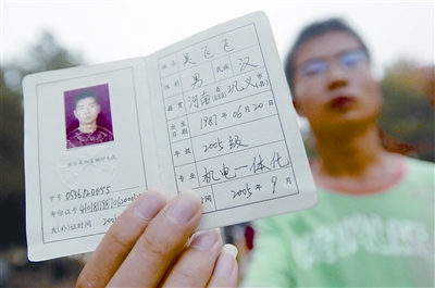 小吴的学生证上清楚地显示出他的入学时间。记者 熊波 摄