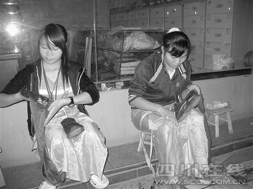 在一家火锅店,电子专业高二学生邱飞询问一位顾客是否需要擦鞋——行话叫做“联系货物”。和一般的擦鞋人一人擦一双不一样,学生们的擦鞋是流水作业:第一人先用清水勾缝、第二人上油、第三人用刷子抛光、第四人用抹布抛光……一双皮鞋经数人之手后,换得1元酬劳。