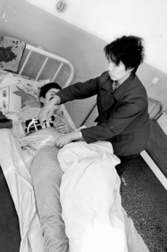 妈妈在照顾受伤的儿子 记者 陈澈 摄