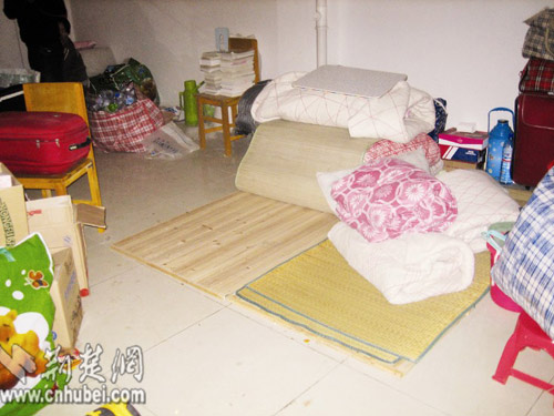 记者程翔报道:昨晚,湖北经济学院众多学生因无床可睡,只好打地铺度过漫漫寒夜。“你看,这就是我们的寝室,床都被拆走了。”昨晚7时30分许,一名女学生指着一片狼藉的宿舍对记者如是说(如上图)。据她介绍,宿舍住的是该校会计学院自考班大二的学生。大一的时候,她们住在东湖边的滨湖校区。今年9月,学校下发通知,称已在该校大门对面商业街旁修好了几栋宿舍,让她们搬过去。