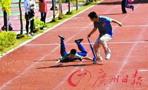本报讯 (记者刘文亮 通讯员廖金钊)一条红绳拉近了普通人和残疾学生的距离。昨日,广州市盲人学校在市75中学高中部体育场举行第十四届运动会,共有 200多名盲校学生同场竞技。据了解,为了保障学生的正常比赛,共有80多名教职工和150余名来自广州体院等学校的志愿者在赛场上进行“一对一”保护工作。