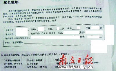 25日,深圳某新闻网站的论坛上出现一则《学校出卖学生家长信息引发的疑问》的帖子。该帖子称,就读深圳南山某名校———“北×附中”的家长,收到学校派发一份的“调查表”:比方孩子学习成绩怎么样啊?孩子能自觉完成家庭作业吗?孩子与父母的关系如何等等。虽然这些与中学生实际年龄不符的“调查”,令家长感到莫名其妙,但见是学校派发下来的问卷,家长们还是认真填写,并按要求写上家长姓名,家庭住址,电话(包括手机)号码等。此后,就不断受到“北京华×天骄教育咨询有限公司”催买《天之骄巧学365家庭学习辅导》的电话。