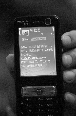 陈女士昨天对记者说,11月29日凌晨4时38分,她收到一条短信,上面写着:“爸妈,我与朋友同居被公安抓住,请速去农行打5800元到这卡上6228480461008157913,姓名:杨国军,不让打电话,详情出来再说。”而发送人竟然是一个陌生人的号码:13529330385。陈女士告诉记者,她女儿阿燕(化名)在肇庆某职业技术学院读大一,由于之前已提前向她提醒说至少有四五名学生的家长都收到了这条短信,因此她并没有再理会。